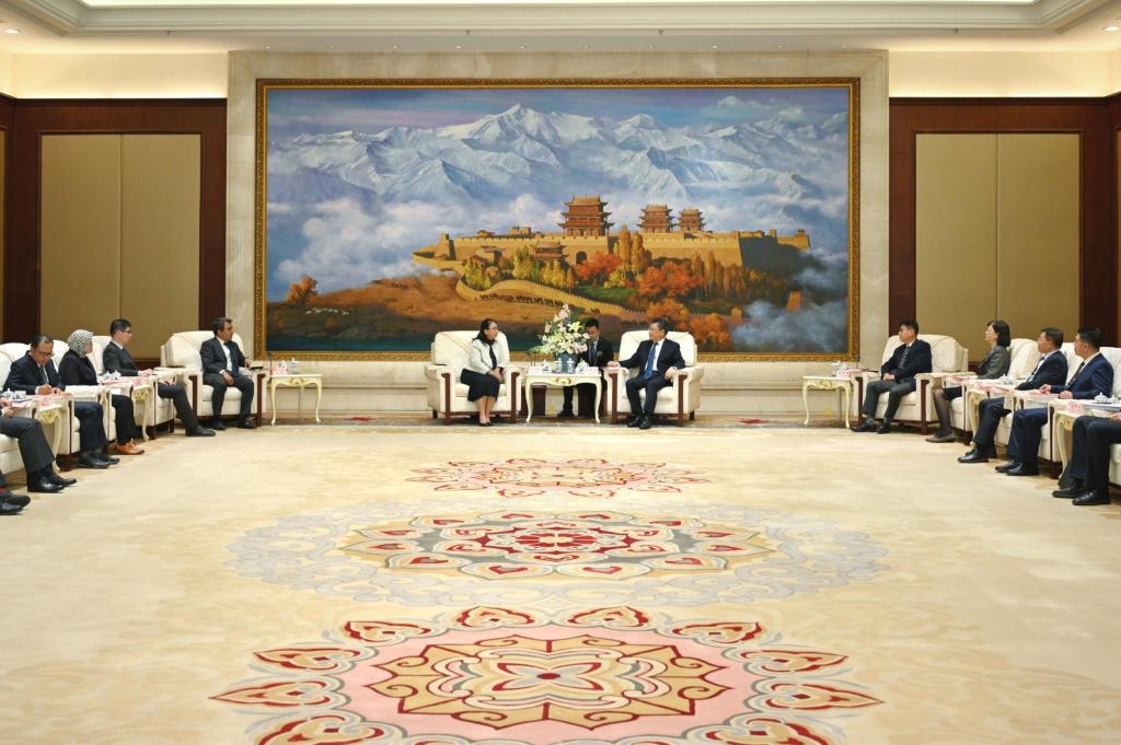 任振鶴對代表團(tuán)一行表示歡迎,向外交部長期以來為促進(jìn)甘肅對外開放和交流合作給予的支持表示感謝。他說,習(xí)近平主席曾指出,甘肅地域遼闊,自然風(fēng)光優(yōu)美,黃土高原、廣袤草原、茫茫戈壁、潔白冰川構(gòu)成了一幅雄渾壯麗的畫卷,宛如一柄“玉如意”。甘肅是中華文明的一扇窗口、絲綢之路的一顆明珠、資源能源的一座寶庫、科技創(chuàng)新的一片高地、發(fā)展產(chǎn)業(yè)的一方沃土。當(dāng)前,甘肅深入貫徹落實(shí)習(xí)近平主席對甘肅重要講話重要指示批示精神,聚焦經(jīng)濟(jì)建設(shè)這一中心工作和高質(zhì)量發(fā)展這一首要任務(wù),完整、準(zhǔn)確、全面貫徹新發(fā)展理念,在轉(zhuǎn)方式、調(diào)結(jié)構(gòu)、提質(zhì)量、增效益上持續(xù)用力,全省經(jīng)濟(jì)社會發(fā)展呈現(xiàn)穩(wěn)神競進(jìn)、進(jìn)中提質(zhì)、結(jié)構(gòu)改善、勢能俱增的良好態(tài)勢,全面建設(shè)社會主義現(xiàn)代化幸福美好新甘肅邁出堅實(shí)步伐。甘肅高質(zhì)量發(fā)展的道路是一條開放之路、合作之路、共贏之路,我們愿同各國朋友進(jìn)一步加強(qiáng)交流合作,共沐如意甘肅的大美風(fēng)光,共享交響絲路的無限商機(jī),共同書寫甘肅與世界聯(lián)通、相通、融通的新篇章。