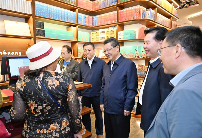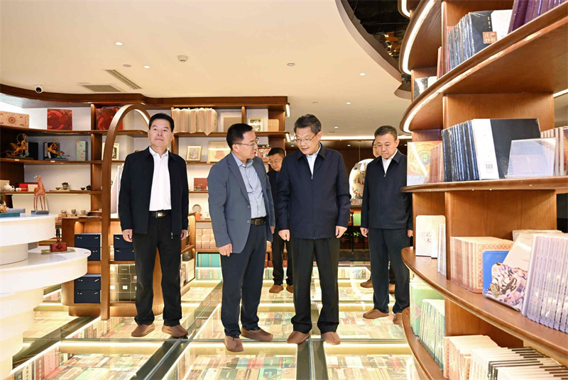 任振鶴先后來(lái)到敦煌印局、敦煌無(wú)界、敦煌書局和敦煌集·非遺文化街區(qū),詳細(xì)了解文化產(chǎn)業(yè)發(fā)展和非遺文化街區(qū)建設(shè)等情況。他指出,敦煌文化延續(xù)近兩千年,是世界現(xiàn)存規(guī)模最大、延續(xù)時(shí)間最長(zhǎng)、內(nèi)容最豐富、保存最完整的藝術(shù)寶庫(kù)。要不斷擦亮敦煌文化名片,圍繞建設(shè)世界文化遺產(chǎn)保護(hù)的典范和敦煌學(xué)研究高地,把握傳承和創(chuàng)新的關(guān)系,找準(zhǔn)契合處、聯(lián)結(jié)點(diǎn),加快業(yè)態(tài)融合、產(chǎn)品融合、市場(chǎng)融合、服務(wù)融合,在更高起點(diǎn)、更高層次、更高目標(biāo)上讓敦煌文化“活起來(lái)”“潮起來(lái)”,為現(xiàn)代化建設(shè)提供有力文化支撐。