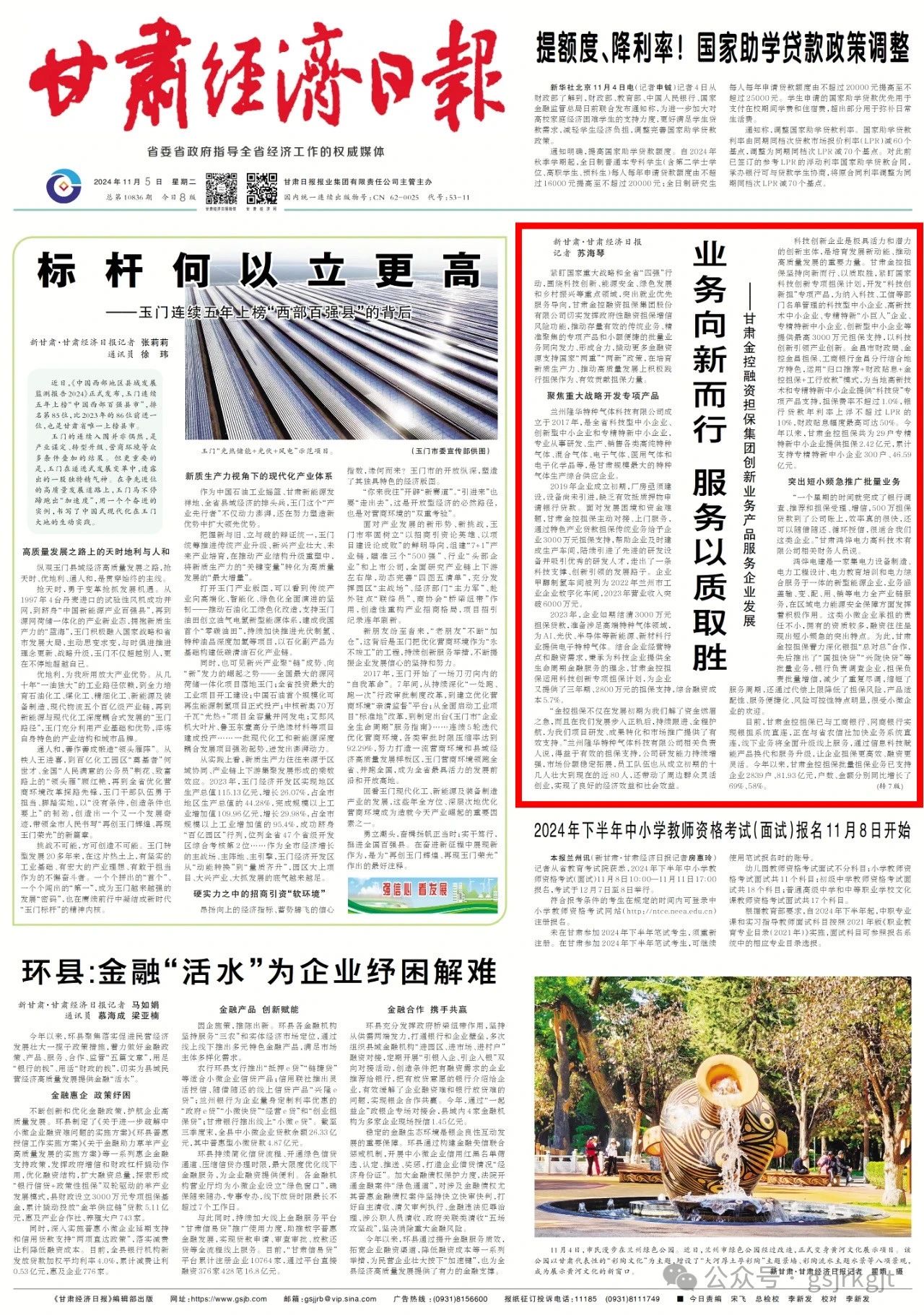 其實,除了“科技創新擔”專項產品外,甘肅金控擔保“設備擔”專項產品,最高擔保額度3000萬元,平均擔保費率1%,重點為工業、交通、農業等全省7大領域符合條件的中小企業提供擔保支持,幫助企業設備更新和技術改造,助力傳統產業煥新升級、新興產業蓬勃壯大,帶動擴大有效投資和市場消費,已為蘭州新區、酒泉等地企業提供擔保3000多萬元?!皥@區擔”專項產品細則正在加快完善,按照“資源共享、風險共擔、優勢互補”原則,由園區、銀行、擔保協同推進,分層分類滿足園區內初創期、成長期及成熟期企業差異化擔保需求?!班l村振興擔”專項產品已為71戶企業提供擔保2.7億元,助力鄉村產業發展和鄉村設施建設,帶動更多農戶穩定就業和增收致富。