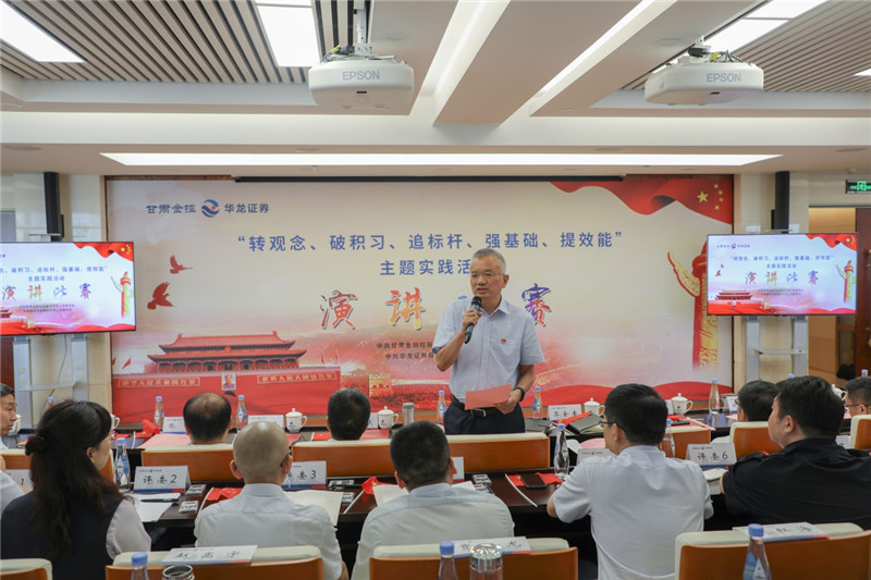 金控集團黨委書記、董事長,華龍證券黨委書記、董事長陳牧原致辭,指出在這個特殊的日子里,我們開展主題黨日活動和演講比賽,恭賀中國共產黨成立99周年,意義重大。同時強調,集團黨委針對經營管理中顯現的一些問題,在全系統(tǒng)開展“轉觀念、破積習、追標桿、強基礎、提效能”主題實踐活動,倡導廣大員工以自我革新的勇氣,破除企業(yè)行政化、機關化的積習陋習,樹牢市場經營觀念,對照標桿,俯身抬頭干實事,提高效能強執(zhí)行,勇于進取,奮勇爭先,創(chuàng)造更好的業(yè)績,為黨旗添彩,為黨的生日獻禮。
