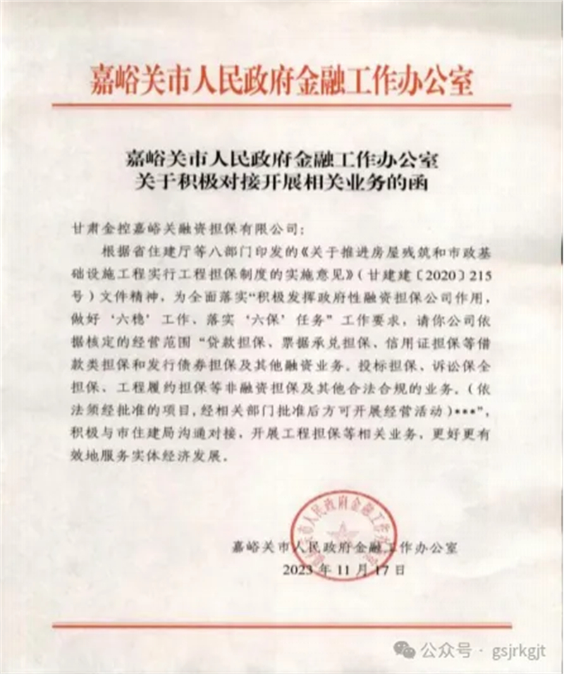 金控嘉峪關擔保公司通過開展履約保函等工程擔保業(yè)務,在助力強化建筑領域風險管理和建立健全建筑市場誠信機制中充分發(fā)揮政府性融資擔保機構職能,為更好服務地方實體經濟發(fā)展努力貢獻自身力量。